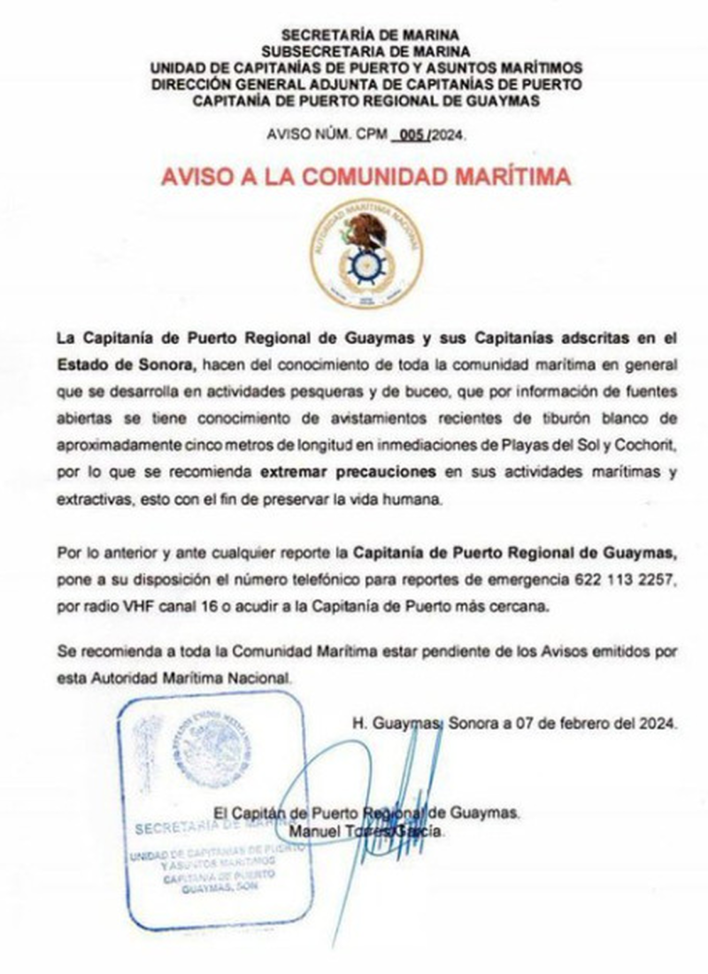 La Capitanía del Puerto Regional de Guaymas, Sonora, alertó a la comunidad marítima a tomar precauciones debido al avistamiento de un tiburón blanco en inmediaciones de las Playas del Sol y Cochorit.