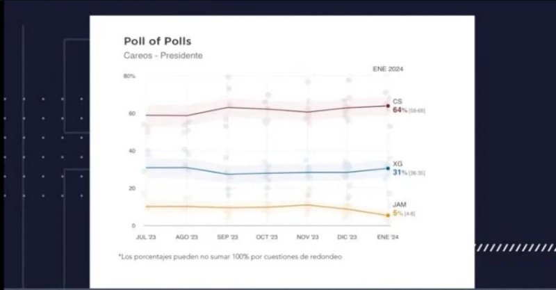 De acuerdo con la “encuesta de encuestas” de Oráculus, la exjefa de Gobierno de la Ciudad de México logró un 64 por ciento de la intención del voto, mientras que la panista logró 31 por ciento y el emecista un 5 por ciento.