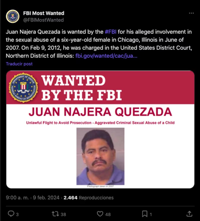 El Buró Federal de Investigaciones o Federal Bureau of Investigation (FBI) busca al mexicano Juan Najera Quezada, quien está relacionado con su presunta implicación en el abuso sexual de una niña de seis años en Chicago, Illinois, en junio de 2007, y de otro menor de edad que fue agredido mientras el hombre se encontraba en libertad bajo fianza.