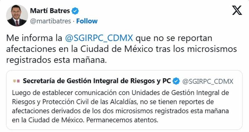 Martí Batres, jefe de gobierno de la Ciudad de México, anunció que hasta el momento no se reporta ningún daño en la capital del país así como ninguna eventualidad en el transporte público tras los dos microsismos registrados esta mañana, en entrevista para "Noticias de la Mañana" con Mario Maldonado para El Heraldo Televisión que se transmite mediante la señal de El Heraldo Media Group.