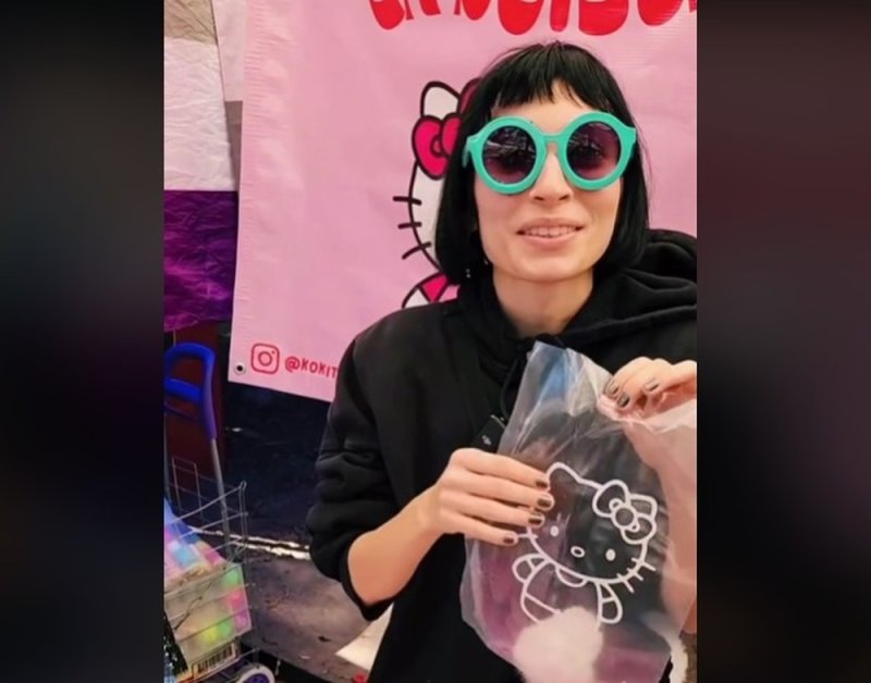 En el video se observa a una mujer, con cabello corto y lentes azules, en un puesto ambulante con un envase de refresco de cola y bolsas de plástico impresas con la imagen de Hello Kitty, atendiendo a unas clientes que le preguntan sobre qué opinan las personas de su negocio. Esto respondió.