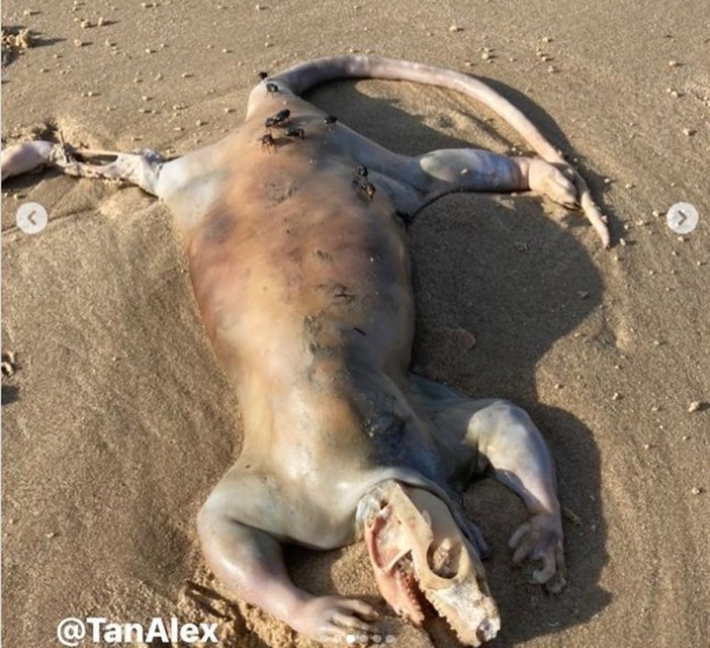 Al principio registró clips de su increíble hallazgo el 21 de marzo en Maroochydore Beach, a unos 100 kilómetros de Brisbane. El animal poseía “manos humanas, cola larga de lagarto, nariz de zarigüeya y parches de pelaje negro”. El joven publicó las imágenes en su cuenta de Instagram y mostró a la criatura varada en la orilla de la playa.