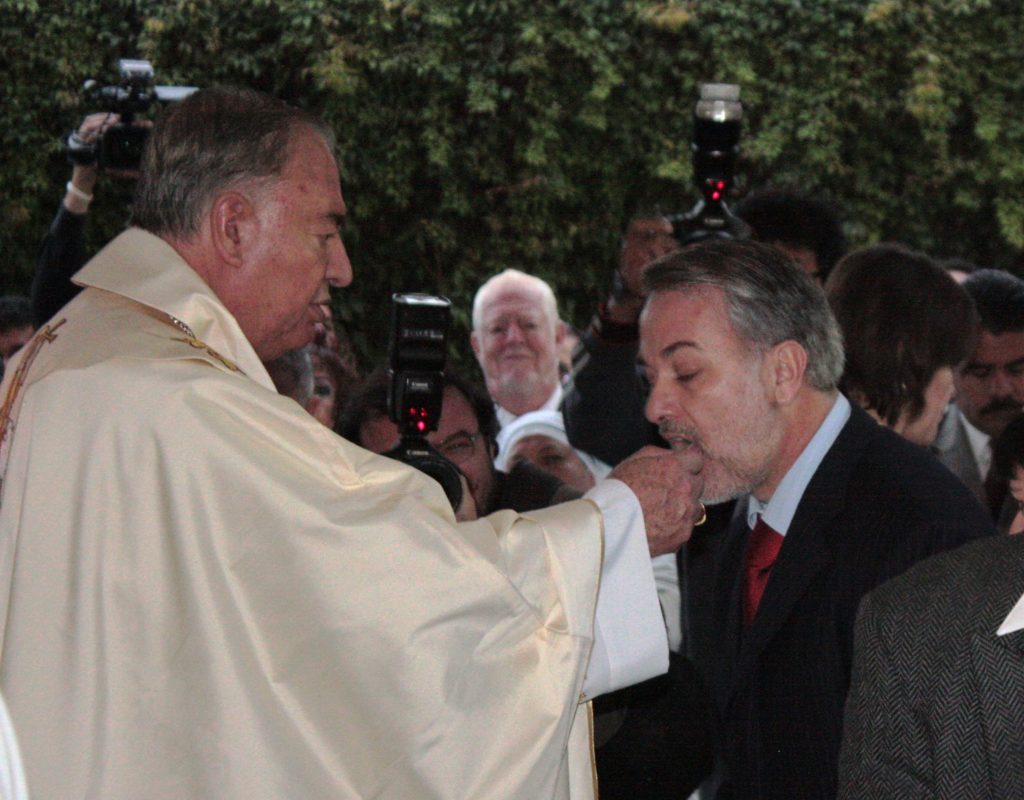 Emilio González Márquez recibe la comunión de manos del cardenal Juan Sandoval Iñiguez. Foto: Especial.