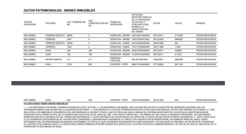 Peña dijo tener nueve bienes inmuebles, entre casas, departamentos y terrenos, de los cuales seis suman un valor de 21.4 millones de pesos. Sobre los tres restantes es difícil conocer su precio, pues se compraron en la década de los 80, con “viejos pesos”.