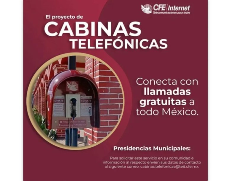 De acuerdo con la página oficial (CFE TEIT), las cabinas deben ser solicitadas directamente por el presidente municipal, ya que se solicitarán datos de contacto del alcalde y deberán ser enviados a: cabinas.telefónicas@teit.cfe.mx , además ponen a disposición el número de atención al cliente 5528344800 opción 5.