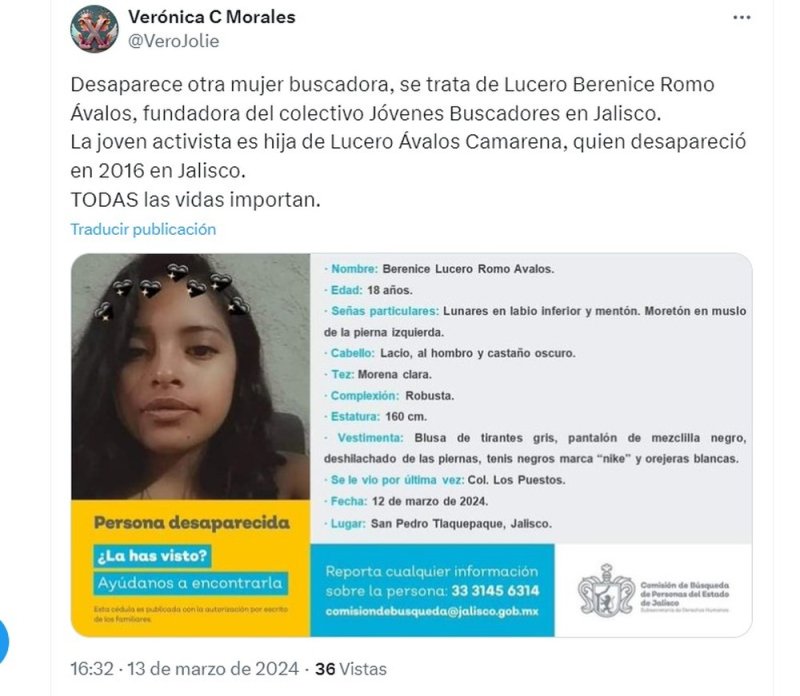 En un comunicado emitido por Ceci Flores, líder del colectivo Madres Buscadoras de Sonora, se especifica que desde 2016, Berenice Romo estableció su propio grupo, Jóvenes Buscadores de Jalisco, para iniciar la búsqueda de su madre, Lucero Camarena, quien actualmente tendría 34 años. A pesar de no haber encontrado a sus familiares, dos policías se encuentran en prisión como presuntos responsables.