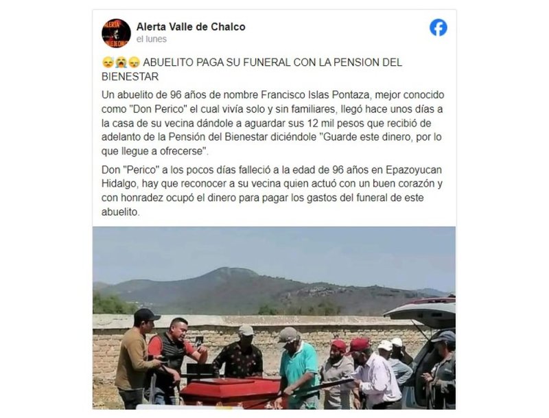La historia de Don Francisco Islas Pontaza, conocido como Don Perico, ha conmovido a muchos en las redes sociales. Este abuelito de 96 años, que vivía solo en Epazoyucan, estado de Hidalgo, decidió utilizar el adelanto de la Pensión del Bienestar para pagar su propio funeral.
