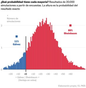 Un estudio de el diario El País revela lo que podría ocurrir el 02 de junio de las elecciones presidenciales: Claudia Sheinbaum arrasaría pues tiene un 89% de probabilidades de ganar.