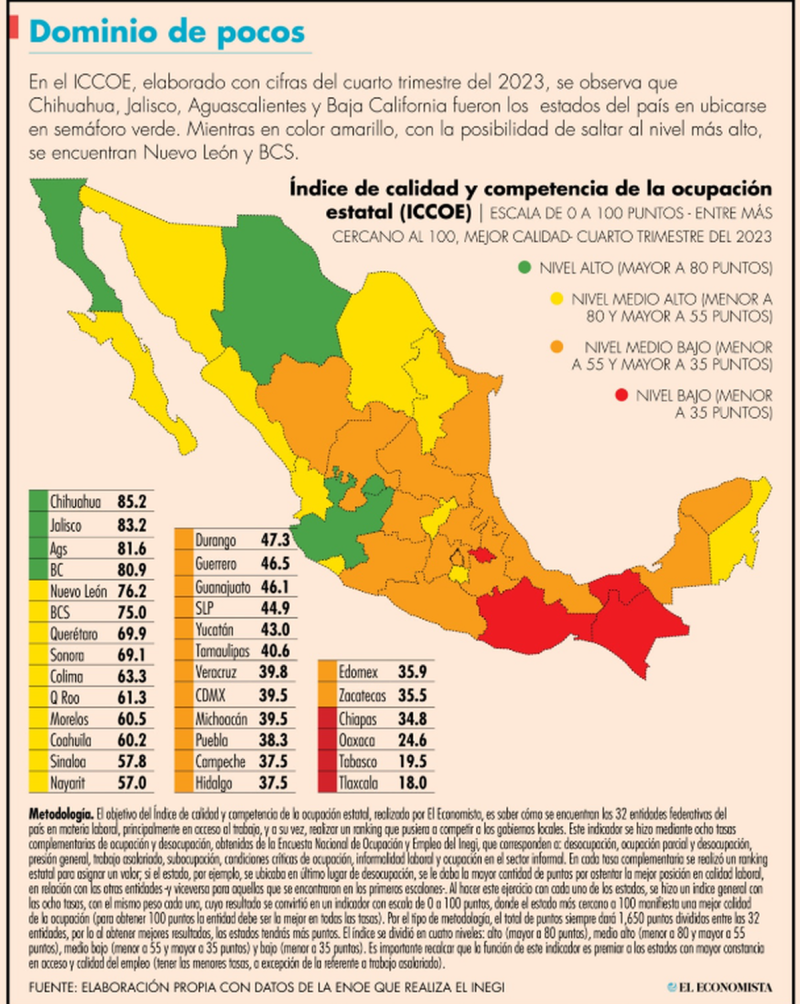 De acuerdo con el Índice de calidad y competencia de la ocupación estatal de El Economista (ICCOE), Chihuahua, Jalisco, Aguascalientes y Baja California lograron ser los únicos estados en semáforo verde en el cuarto trimestre del año pasado, es decir, con un nivel alto.