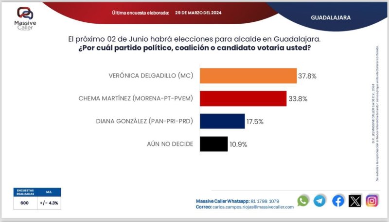 Guadalajara, Jalisco; 01 de abril de 2024. De acuerdo con los resultados del más reciente estudio de opinión de la casa encuestadora Massive Caller, la candidata de MC a la alcaldía de Guadalajara, Verónica Delgadillo tendría una ventaja sobre sus principales contrincantes.