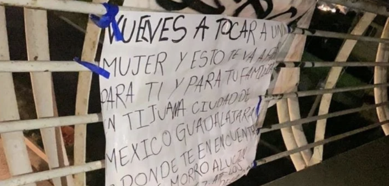 En el mensaje se lee: “ vuelves a tocar a una mujer y esto te va a pasar a ti y a tu familia en Tijuana, Ciudad de México, Guadalajara donde te encuentre pinche morro alucin Fofo Márquez. Atte los de la casa".