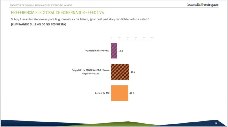 Ante la pregunta “si hoy fueran las elecciones para la gubernatura de Jalisco, ¿por cuál partido y candidato partido votaría usted?” La respuesta de los encuestados en votación efectiva fue de 44.2 por ciento para Claudia Delgadillo González de la coalición “Sigamos haciendo historia en Jalisco” (Morena, PT, PVEM); seguida por Jesús Pablo Lemus Navarro de Movimiento Ciudadano con un 41.6 de la intención del voto. Laura Haro del Frente conformado por PAN, PRI y PRD aparece en tercer lugar con el 14.2 por ciento de las menciones.
