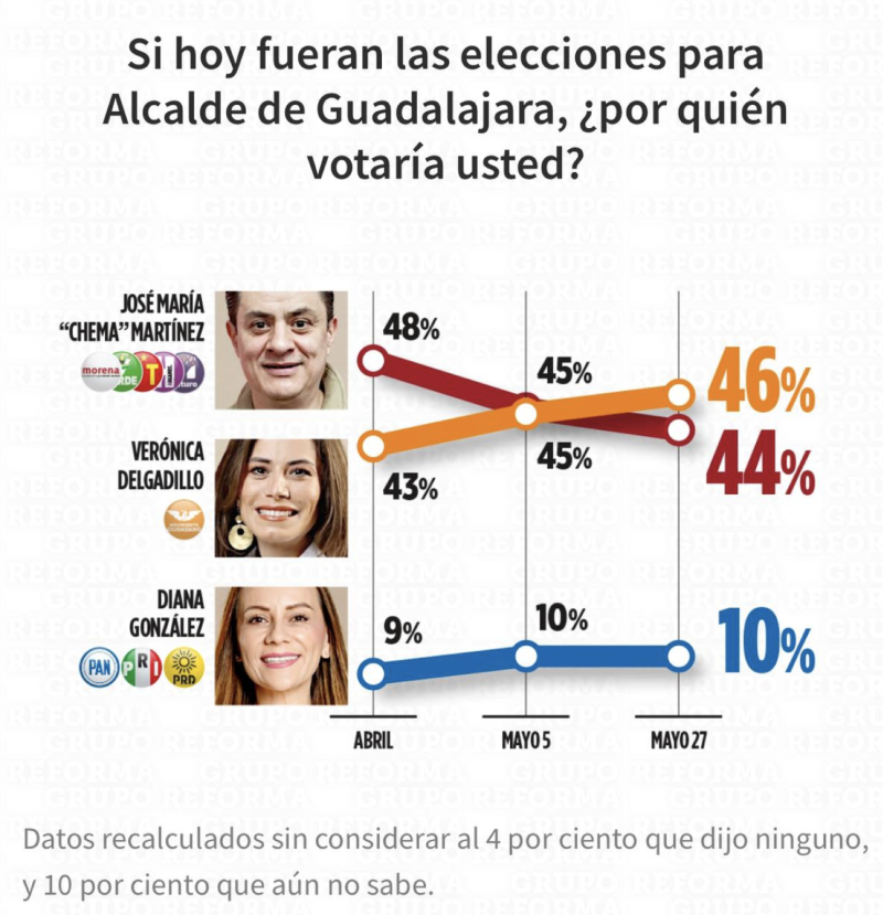 Guadalajara, Jalisco; 28 de mayo de 2024. A unos días de las elecciones del domingo 02 de junio la ciudad de Guadalajara se perfila para tener a su primera a alcaldesa electa en la figura de Verónica Delgadillo, de acuerdo con la más reciente encuesta del Grupo Reforma y de otras empresas especializadas.