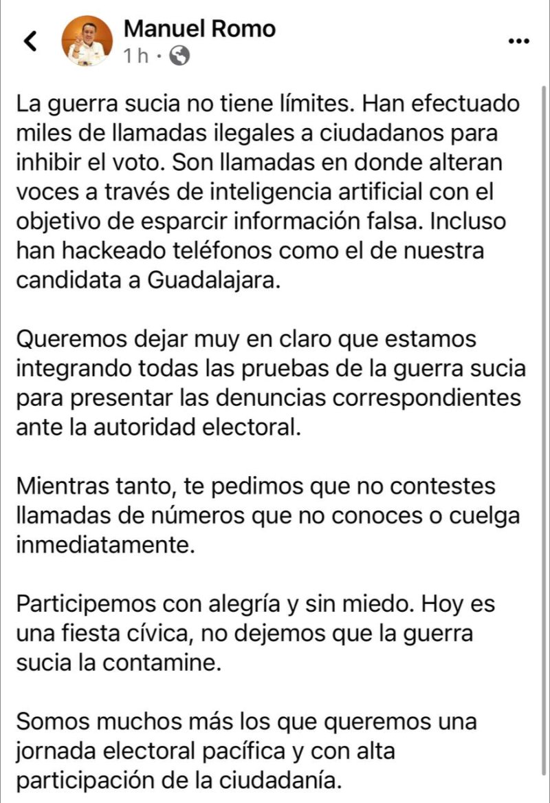 “La guerra sucia no tiene límites. Han efectuado miles de llamadas ilegales a ciudadanos para inhibir el voto. Son llamadas en donde alteran voces a través de inteligencia artificial con el objetivo de esparcir información falsa. Incluso han hackeado teléfonos como el de nuestra candidata a Guadalajara.