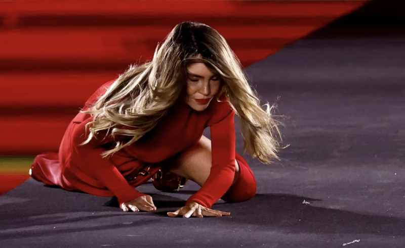 Acerca del atuendo que lució la artista fue un conjunto de falda corta y blusa de manga larga en color rojo brillante, así como las medias y plataformas con las que Belinda perdió el equilibrio. Las cuales son creación de las diseñadoras de Turquía Raisa y Vanessa Sason.