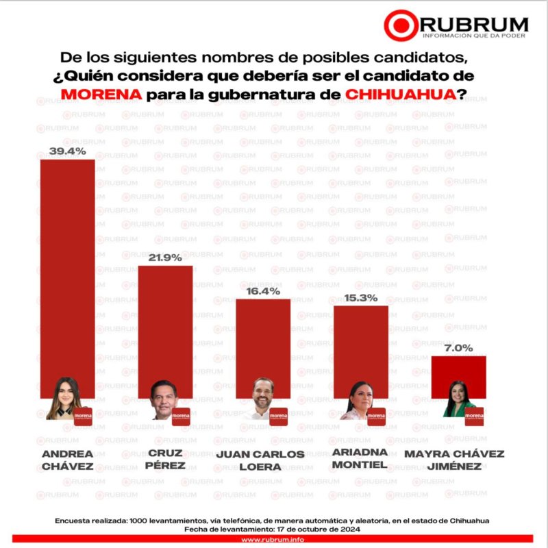 La senadora morenista Andrea Chávez Treviño, lleva la delantera en la carrera por la gubernatura de este estado del norte del país. Según los resultados de la encuesta "Tendencias de los precandidatos al Gobierno de Chihuahua rumbo al 2027", realizada por la empresa RUBRUM, Chávez Treviño lidera las preferencias dentro de su partido y goza de un alto nivel de reconocimiento en el estado.