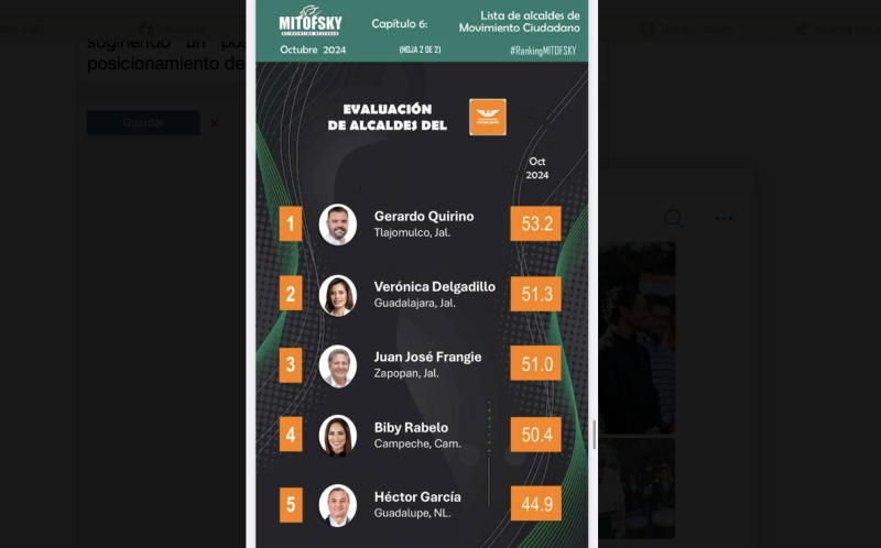 Dentro del panorama nacional, Gerardo Quirino Velázquez también sobresale entre los alcaldes del partido Movimiento Ciudadano. Él lidera la lista con la mayor aprobación, seguido por Verónica Delgadillo de Guadalajara, quien cuenta con un 51.3% de aprobación, y Juan José Frangie, alcanzando un 51% de aceptación ciudadana.
