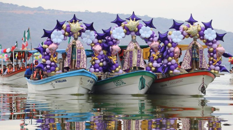 Las figuras religiosas de Melchor, Gaspar y Baltazar realizaron su tradicional recorrido por las calles del pueblo y su embarcación en la laguna de Cajititlán, donde los fieles participaron en el ritual para pedir un año próspero y un buen temporal para la región.