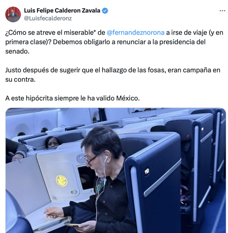 “¿Cómo se atreve el miserable de Fernández Noroña a irse de viaje (y en primera clase)? Debemos obligarlo a renunciar a la presidencia del senado", dijo el hijo de Calderón y Zavala de manera sarcástica.