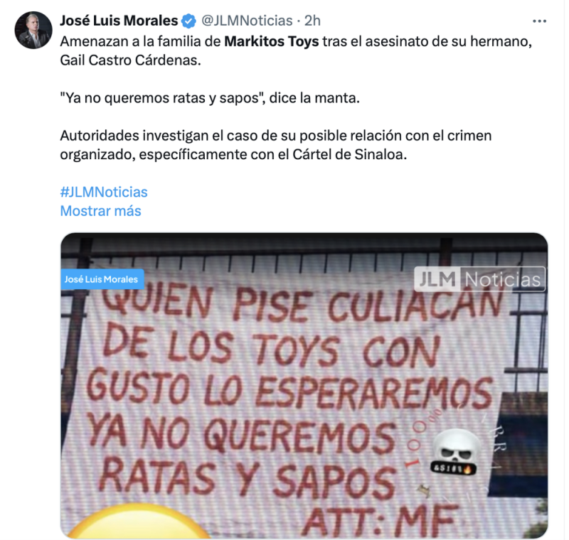 La amenaza se encontró en una manta que se colocó en un puente en la capital sinaloense, Culiacán, el pasado domingo 30 de marzo. Según la manta, “Quien pise Culiacán de los Toys con gusto los esperamos. Ya no queremos ratas y sapos”.