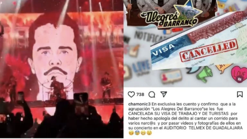 "En exclusiva les cuento y confirmo que a la agrupación Los Alegres Del Barranco se les fue cancelada su visa de trabajo y de turista por haber hecho apología del delito al cantar un corrido para varios narcos y por pasar videos y fotografías de ellos en su concierto en el Auditorio Telmex de Guadalajara", escribió.