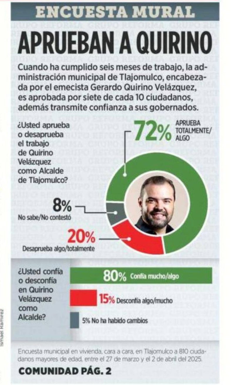 La encuesta, realizada en vivienda del 14 al 22 de marzo, incluyó a más de 800 habitantes del municipio y ofrece una radiografía clara de los primeros meses del gobierno municipal. Aunque la seguridad sigue siendo el principal problema percibido por la ciudadanía, los datos indican que Gerardo Quirino ha logrado construir una base de respaldo que le permite gobernar con legitimidad y confianza.