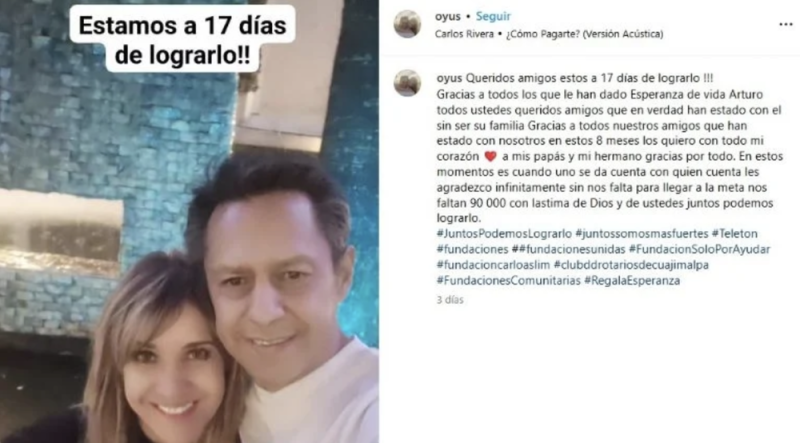 A través de su cuenta oficial de Instagram, Oyuki ha dado algunos avances sobre la situación y confirmó recientemente que aún les faltaban 90 mil pesos para llegar a la meta: "Queridos amigos estos a 17 días de lograrlo, gracias a todos los que le han dado esperanza de vida Arturo, gracias a todos nuestros amigos que han estado con nosotros en estos 8 meses los quiero con todo mi corazón, a mis papás y mi hermano gracias por todo".
