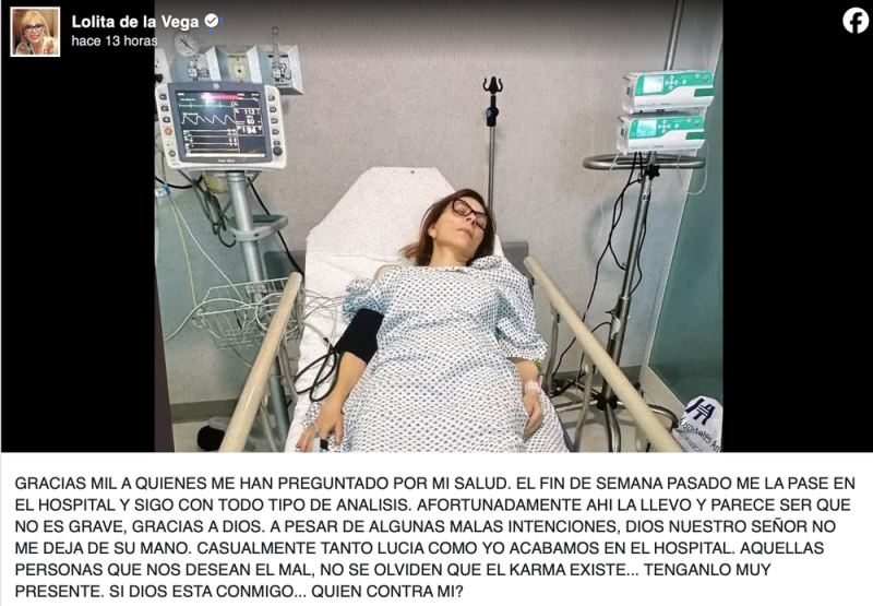 Se trata de la reconocida Lolita de la Vega, quien usó su cuenta de Facebook para publicar un extenso mensaje donde informó de su recaída de salud, acompañada con una imagen donde aparece en la cama del nosocomio; la conductora explicó que aún no le han confirmado el padecimiento que la aqueja, pero dejó entrever que no descarta la idea de que fue algo provocado.