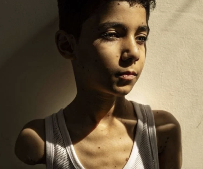 La imagen, tomada por la fotógrafa palestina Samar Abu Elouf, radicada en Qatar, para The New York Times, muestra a Mahmoud Ajjour, de nueve años, con ambos brazos amputados justo por debajo de los hombros.