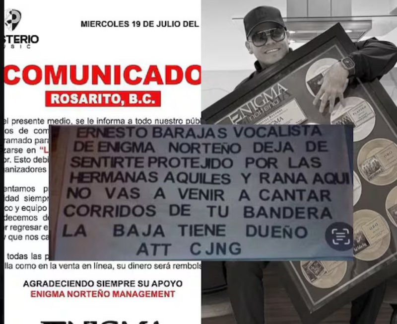 Hace dos años, en julio de 2023, se informó sobre la aparición de narcomantas que amenazaban con asesinar a Ernesto Barajas, el vocalista de Enigma Norteño, si este continuaba con su presentación en Baja California.