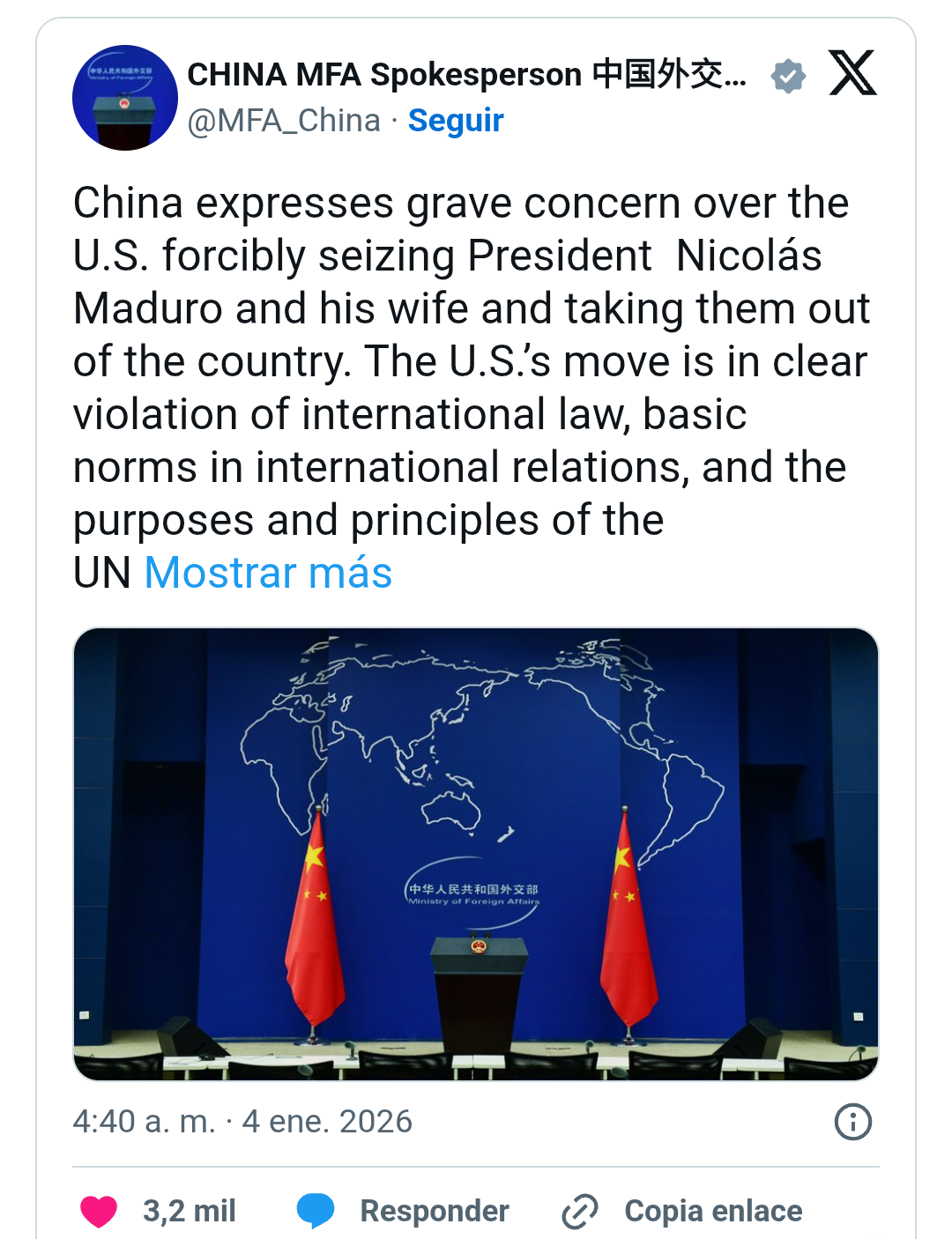 El portavoz del Ministerio de Exteriores chino Lin Jian expresó la «grave preocupación» de Beijing por el secuestro del mandatario y la primera dama de Venezuela y pidió a Estados Unidos que «garantice su seguridad personal» y proceda a su «liberación inmediata».