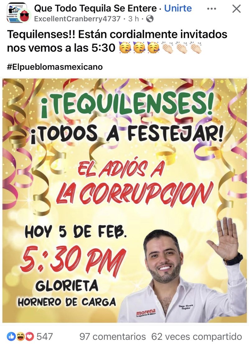 Tequila, Jalisco.— A través de redes sociales comenzó a circular una publicación en la que se invita a la población de Tequila a participar en un festejo denominado “Adiós a la corrupción”, luego de la detención de Diego Rivera, alcalde del municipio.
