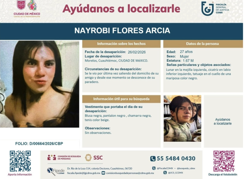 El cuerpo de la joven de 27 años, Nayrobi Flores Arcia, reportada como desaparecida el pasado 26 de febrero, fue hallado en un parque de la alcaldía Venustiano Carranza, con presuntos signos de violencia.