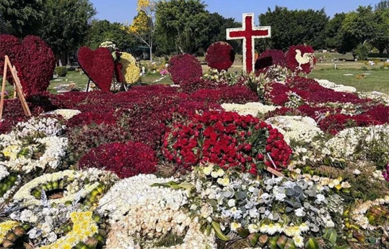 Videos e imágenes difundidos en plataformas digitales muestran el lugar prácticamente cubierto por coronas y ramos, algunos organizados en figuras y con una gran cruz elaborada con flores colocada en el centro del espacio funerario.