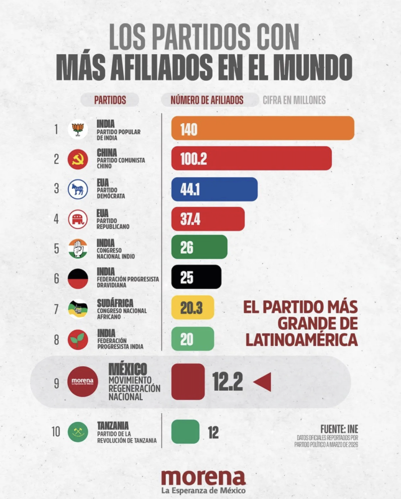 De acuerdo con los datos reportados por cada unos de los partidos del mundo en marzo de 2026, Morena se consolidó entre las 10 fuerzas políticas más grandes del mundo. El partido guinda, que durante prácticamente todo 2025 se dedicó a aumentar sus filas con una campaña de afiliación voluntaria, sumó en total 12.2 millones de militantes.
