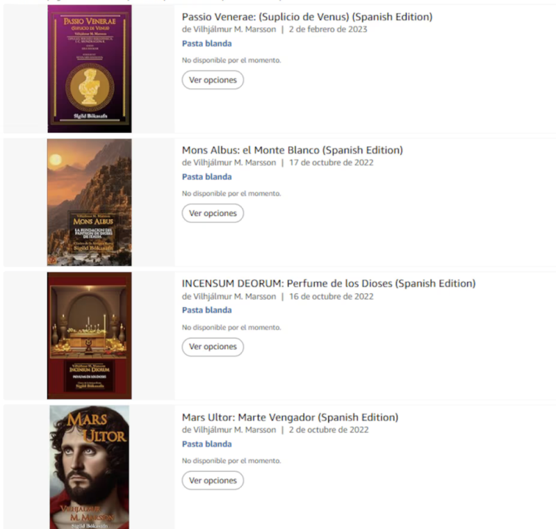 A este mismo nombre se tienen registrados otros títulos que estaban a la venta en Amazon, entre los títulos identificados se encuentran “La empresa de Marte”, “Mars Ultor: Marte Vengador”, “Passio Venerea: Suplicio de Venus”, “Mons Albus: el Monte Blanco” e “Incensum Deorum: Perfume de los Dioses”.